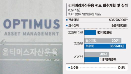 리커버리운용 관계자는 "옵티머스펀드의 자산은 대부분 출처가 불분명하고, 수표와 현금 거래의 경우 증빙이 어려워 사실상 회수가 불가능한 상황"이라며 "그럼에도 회수목표액을 1200억원으로 높여 잡았고, 연내 목표액 대비 50% 이상의 회수가 가능할 것"이라고 설명했다.