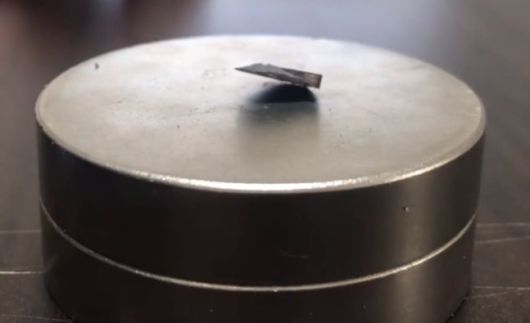 국내 민간기업 퀀텀에너지연구소 등 연구팀이 개발했다고 밝힌 상온 초전도체 모습. 자석 위에 몸체 일부가 떠 있다. / 사진제공=퀀텀에너지연구소 |