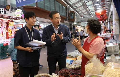 이형일(가운데) 통계청장이 14일 서울 남구로시장에서 상인을 만나 물가 조사 협조를 당부하고 있다. [통계청 제공. 재판매 및 DB금지] |