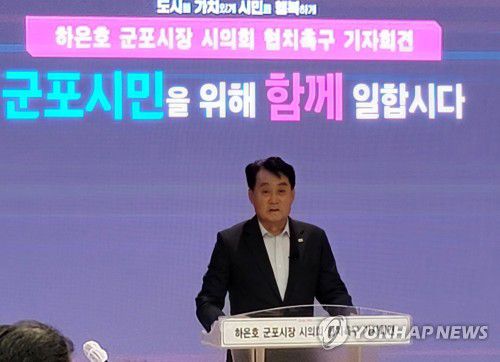 (군포=연합뉴스) 김인유 기자 = 민선 8기 들어 더불어민주당이 다수당인 시의회와 갈등을 빚고 있는 하은호(국민의힘) 경기 군포시장이 협치와 소통을 통해 하나가 되자고 시의회에 촉구했다.