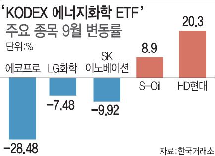 KODEX 에너지화학은 에코프로(086520), LG화학(051910), SK이노베이션(096770)이 비중 상위다. TIGER 200에너지화학은 에코프로를 담고 있지 않아 상대적으로 낙폭이 덜한 것으로 풀이된다. 황제주 자리를 내준 에코프로는 이달 28.48% 하락해 지난 13일엔 90만원선도 깨졌다. SK이노베이션은 정유사업을 영위하고 있지만, 주가가 2차전지 모멘텀에 영향을 받으면서 이달 9.30% 하락했다.