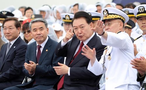 윤석열 대통령이 15일 인천항 수로 및 팔미도 근해 노적봉함에서 열린 제73주년 인천상륙작전 전승기념식에서 이종호 해군참모총장과 대화하고 있다. 연합뉴스 |