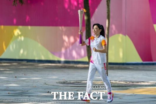 2004 아테네올림픽 100m 평영 금메달리스트인 뤄쉐쥐안(罗雪娟)이 지난 8일 중국 저장성 항저우에서 열린 제19회 항저우 아시안게임 성화 봉송 첫 주자로서 햇불을 들고 달리고 있다. 그는 항저우시 출신이다. / 신화.뉴시스 |