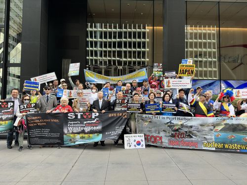 이들은 이날 집회에서 "원전 오염수 해양투기를 중단하라"라고 영어 구호를 외치며 지나가는 뉴욕 시민들에게 원전 오염수 방류 문제에 대한 관심을 호소했다.