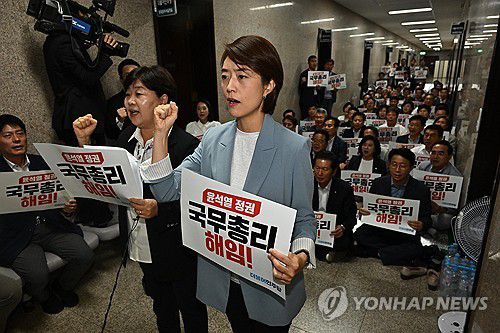 (서울=연합뉴스) 신준희 기자 = 17일 더불어민주당 서영교(왼쪽), 고민정 최고위원 등 의원들이 이재명 대표가 단식 중인 국회 당 대표실 앞에서 대통령실 발언 관련 규탄 성명을 발표한 뒤 국무총리 해임과 내각 총사퇴를 요구하는 구호를 외치고 있다. 2023.9.17 [공동취재]