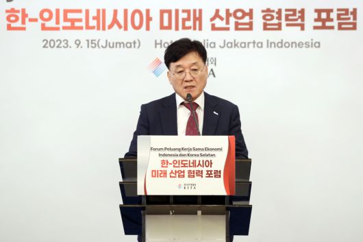 정만기 한국무역협회 부회장이 15일(현지시간) 열린 한-인니 미래산업포럼에서 연사로 나섰다. [무협 제공] |