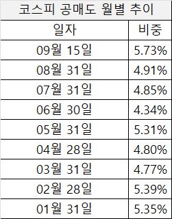18일 한국거래소에 따르면 9월 평균 유가증권시장 공매도 거래대금 비중(공매도 거래대금을 총 거래대금으로 나눈 값)은 5.73%로 올해 들어 가장 높았다. 올해 연평균 공매도 비중 4.96%와 비교할 때 약 1%p 높다. 지난 1월과 2월 공매도 비중은 5.35%, 5.39%를 기록한 뒤 줄곧 4%대를 유지해왔다.