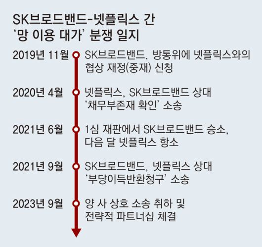 SK브로드밴드와 넷플릭스가 4년 가까이 이어온 ‘망 이용 대가’ 관련 소송을 끝내고 파트너십을 맺어 협력 관계로 돌아서기로 했다. 장기간 분쟁이 더 이상 서로에게 실익이 되지 않는다고 판단해 양측이 협력으로 방향 전환을 했다는 분석이 나온다.