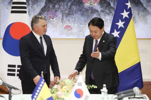제78차 유엔총회 참석차 미국을 방문 중인 윤석열 대통령이 18일(현지시간) 뉴욕에서 열린 한·보스니아 헤르체고비나 정상회담에서 젤코 콤시치 보스니아 헤르체고비나 대통령과 기념촬영한 뒤 자리를 안내하고 있다. 연합뉴스 |