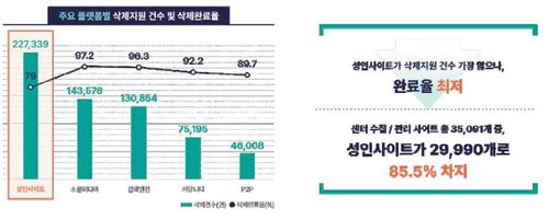 해외에 서버를 두는 등 국내법을 적용할 수 없는 불법 사이트가 증가하면서, 성인사이트의 연도별 불법 촬영물 삭제 완료율도 2018년 71.7%, 2019년 70.5%, 2020년 49.2%, 2021년 60.2%, 2022년 60.6%로 감소세다.