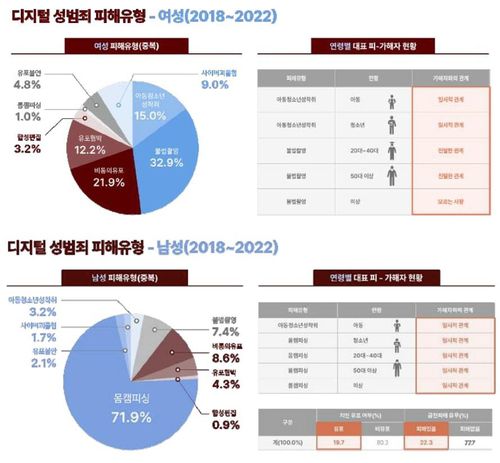 여성의 피해유형(중복)을 보면 불법 촬영이 32.9%로 가장 많았고, 비동의 유포(21.9%), 아동·청소년 성착취(15.0%), 유포협박(12.2%) 등이 그 뒤를 이었다.