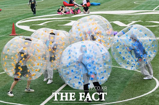 [더팩트ㅣ서예원 인턴기자] 19일 오후 서울 성북구 국민대학교의 가을축제 '플립'이 열린 가운데 학생들이 '버블 배틀' 경기를 하고 있다.