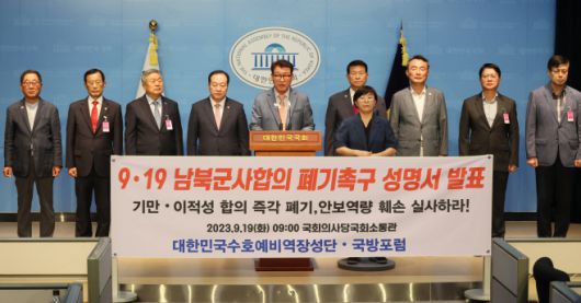 이와 관련해 국회 국방위원장 한기호 국민의힘 의원과 대한민국수호예비역장성단, 행동하는자유국민연대는 19일 국회 소통관에서 기자회견을 열고 9·19 남북군사분야합의서 폐기를 촉구했다.