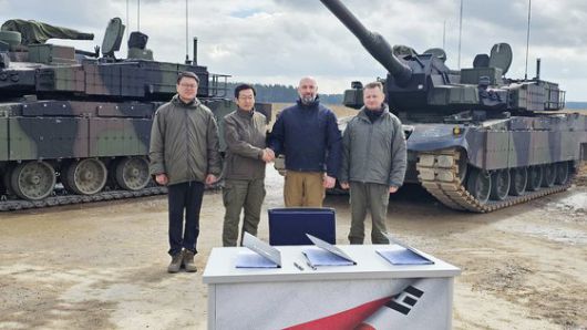 현대로템이 지난 3월 폴란드 국영방산그룹 PGZ 및 PGZ 산하 방산업체인 WZM과 폴란드형 K2 전차 생산ㆍ납품 사업을 진행하기 위한 컨소시엄 이행합의서를 체결했다. 사진은 왼쪽부터 조현기 방위사업청 기반전력사업본부장, 안경수 현대로템 디펜스솔루션사업본부장(전무), 세바스찬 흐바웩 PGZ 회장, 마리우시 브와슈차크 폴란드 부총리 겸 국방부 장관. 사진 현대로템