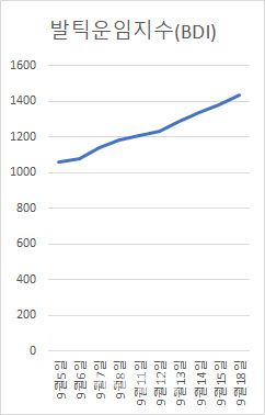 20일 관련업계에 따르면 지난 18일 건화물선 운임 지수인 BDI는 전일대비 58포인트 상승한 1439포인트를 기록했다. 이달 초 1063까지 떨어진 뒤 35% 넘게 상승했다.