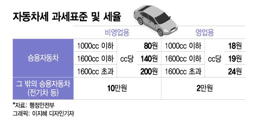 지방세인 자동차세는 1991년부터 배기량을 기준으로 세율이 책정됐다. 비영업 승용차의 경우 과세표준이 △1000cc 이하(cc당 80원) △1600cc 이하(cc당 140원) △1600cc 초과(cc당 200원) 등으로 나눠져 있다. 반면 전기차 등 '그 밖의 승용차' 과세표준은 정액 10만원이다.