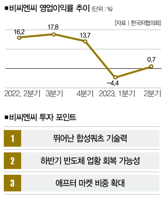 비씨엔씨를 둘러싸곤 호재도 많지만, 지켜봐야 할 변수도 적지 않다. 무엇보다 올 3~4분기 수주가 얼마나 확대될지 예측하기 힘들다. 반도체 불황의 여파 탓에 비씨엔씨의 영업이익률은 16.2%(2022년 2분기)에서 0.7%(올해 2분기)까지 떨어졌다. 반도체 제조사들이 감산하고 있긴 하지만, 언급했듯 4분기에야 업황 회복을 기대할 수 있다.