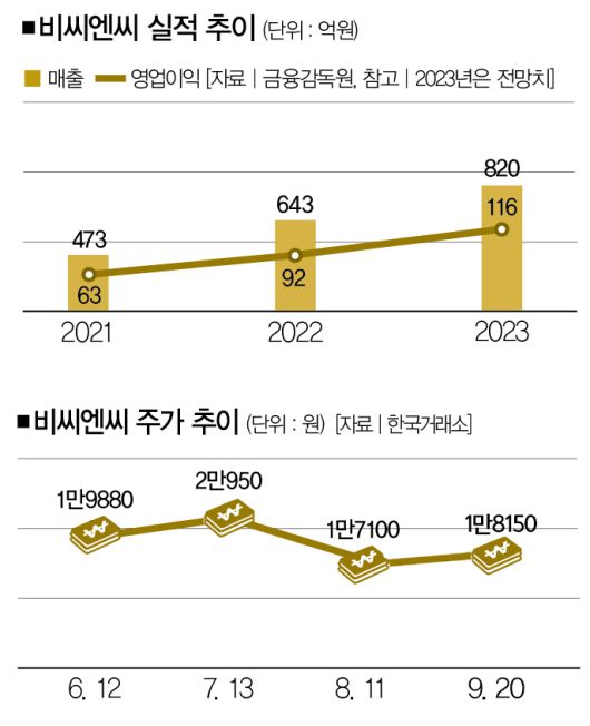 증권사에선 비씨엔시의 올해 매출과 영업이익을 각각 800억원, 116억원으로 전망하고 있지만, 현재 분위기상 달성하기 어려울 가능성도 있다. 이런 상황을 고려해 목표가는 보수적으로 책정, 2만5000원으로 제시한다.