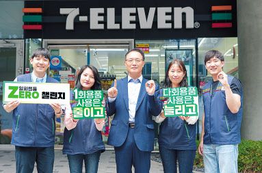 최경호(가운데) 세븐일레븐 대표이사가 일상 속 일회용품 사용을 줄여나갈 것을 약속하는 ‘1회용품 제로 챌린지’에 참여했다. |
