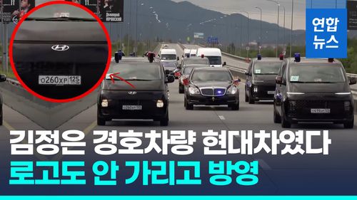 북한 관영 조선중앙TV가 이날 방영한 '조로(북러) 관계 발전의 새로운 이정표를 마련한 사변적 계기'라는 제목의 기록영화를 보면 김 위원장이 탄 것으로 추정되는 최고급 벤츠 차량이 현대차 엠블럼을 달고 있는 검은색 대형 승합차 행렬의 호위 속에 도로 위를 달렸습니다.