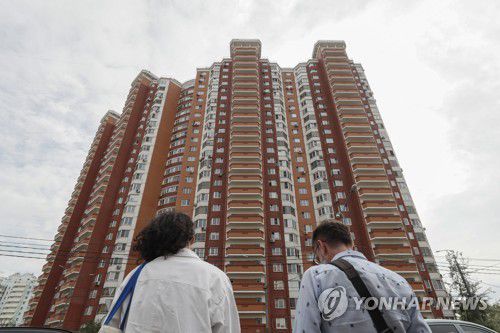 드론 2대가 격추된 이후 건물 밖에 서 있는 모스크바 시민들 |