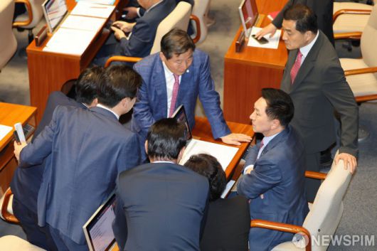 [서울=뉴스핌] 이형석 기자 = 김기현 국민의힘 대표와 의원들이 21일 오후 서울 여의도 국회에서 열린 제410회 국회(정기회) 제08차 본회의에서 이재명 더불어민주당 대표 체포동의안이 가결되자 대화를 나누고 있다. 2023.09.21 leehs@newspim.com |