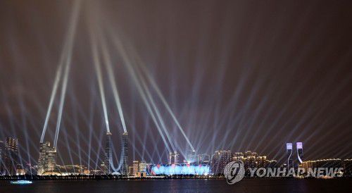 (항저우=연합뉴스) 형민우 기자 = 2022 항저우 아시안게임 개막을 이틀 앞둔 21일 오후 항저우 올림픽 스포츠센터 스타디움과 시내 주변에 라이트 쇼가 화려하게 펼쳐지고 있다. 오는 23일 열릴 개막식은 최첨단 기술을 도입한 3D 와이어와 디지털 점화 등 '스마트 게임'으로 펼쳐질 전망이다. 2023.9.21