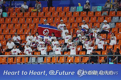 (진화[중국]=연합뉴스) 이상현 안홍석 기자 = 항저우 아시안게임에 참가한 북한의 남자 축구 대표팀 경기에 북한 여성 응원단 수십명이 자리해 응원을 펼쳤다.