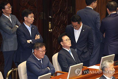 체포동의안 가결에 침울한 민주당(서울=연합뉴스) 신준희 기자 = 더불어민주당 박광온 원내대표 등이 21일 국회 본회의장에서 이재명 대표 체포동의안이 가결되자 어두운 표정을 짓고 있다. 2023.9.21 hama@yna.co.kr kong79@yna.co.kr ▶제보는 카카오톡 okjebo▶연합뉴스 앱 지금 바로 다운받기~▶네이버 연합뉴스 채널 구독하기<저작권자(c) 연합뉴스, 무단 전재-재배포 금지>