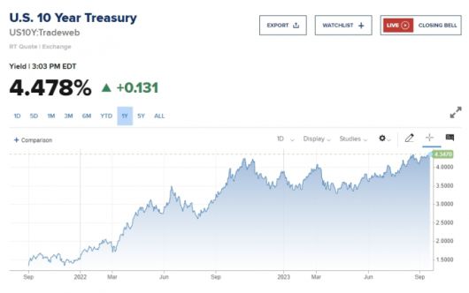 연방준비제도(Fed)가 전일 연내 한 차례 더 금리를 올릴 수 있다고 발표한 이후 국채시장에선 장기채 금리가 치솟았다. 10년 만기 국채 수익률은 15년여 만에 최고치인 4.48%를 기록했다.