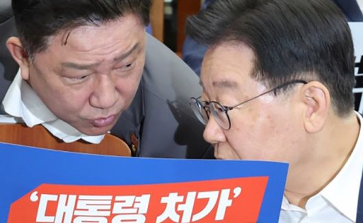 더불어민주당 이재명 대표가 지난7월13일 오전 서울 여의도 국회에서 열린 정책의원총회에서 김병기 의원과 대화하고 있다. 연합뉴스 |