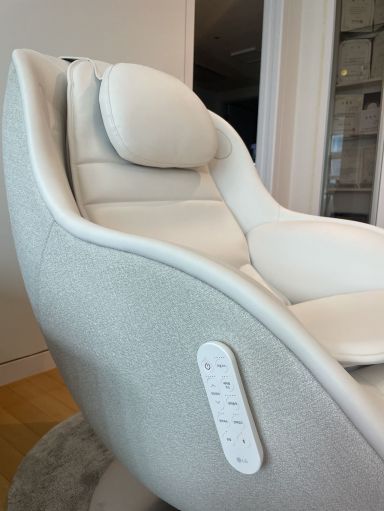긴 선으로 연결돼 있는 리모콘을 깔고 앉는 불편함은 의자에 탈부착 가능한 무선 리모콘으로 말끔히 해결했다. 리모콘 크기도 작고 가벼울뿐 아니라 선이 없어 보기에도 깔끔하다. 리모컨을 자석이 달린 의자 옆면, 또는 팔걸이 부분에 갖다대면 착 붙는다. 다만 붙일 수 있는 면적이 넓지는 않아 잘못 갖다대면 리모콘을 바닥에 떨어뜨릴 수 있으니 조심해야 한다. 다른 안마의자 리모콘들과는 달리 내장된 디스플레이가 없어 안마를 받는 중 남은 시간을 확인하기 어렵다는 것은 단점이다. 시작하기 전에 마사지 시간을 늘리거나 줄일 수 있는 기능이 없어 20분간 진행되는 코스가 종료된 후 더 사용하고 싶다면 다시 리모콘을 만져야 한다.