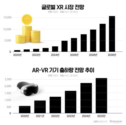 VR(가상현실), AR(증강현실), MR(혼합현실)을 모두 포괄한 XR은 2020년 600억 달러에서 2030년까지 10년간 연평균 38% 성장할 것으로 예측된다. 출하량도 2020년 500만대에서 2025년까지 연평균 39%에 달하는 성장률을 보일 전망이다.