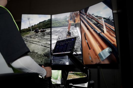원격 조종 스테이션 체험. 양옆에 위치한 조이스틱으로 기계를 움직일 수 있다. 사진=HD현대사이트솔루션 제공 |
