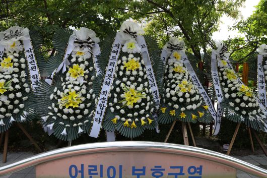 지난달 9일 경기도 의정부시 호원초등학교에 고인이 된 교사를 추모하는 화환이 줄지어 놓여 있다. /연합뉴스 |