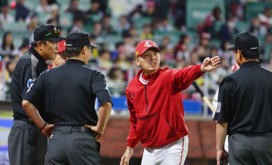 한유섬의 아웃 판정에 김원형 감독은 비디오 판독에 대한 항의는 곧 퇴장임에도 거칠게 항의했다. 항의가 10분이 넘어갈 정도였다. 심판들이 자신들의 판정에 자신이 있었다면 김원형 감독의 항의가 시작되자마자 퇴장을 줬을 법 한데, 10분 이상 자신들의 판정을 설명했다. 아무래도 자신들도 판정에 대한 자신이 없었다고밖에 해석이 안 된다. 10분 이상의 항의 끝에 김원형 감독을 퇴장시켰다.