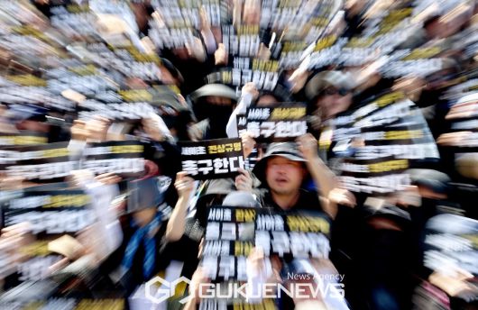전국 각지에서 모인 교사들이 5일 서울 종로구 경복궁역 사거리 인근에서 열린 서이초 진상규명 및 아동학대처벌법 개정을 촉구하는 집회에 참석해 구호를 외치고 있다. /사진=국제뉴스DB |