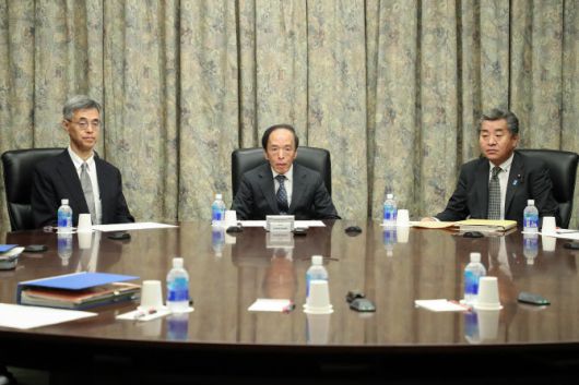 우에다 가즈오(가운데) 일본은행 총재가 22일 일본 도쿄 일본은행 본점에서 회의를 하고 있다. (사진=AFP) |