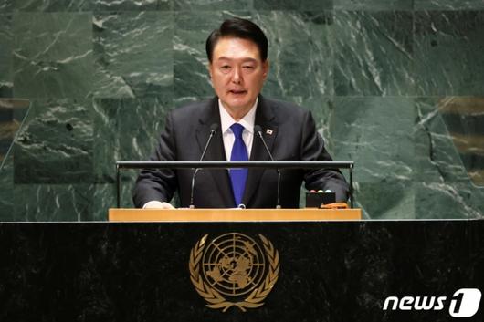 윤석열 대통령이 20일(현지시간) 오후 미국 뉴욕 유엔(UN) 본부에서 열린 제78차 유엔 총회 고위급 회기에 참석해 기조연설을 하고 있다. ⓒ 로이터=뉴스1 |