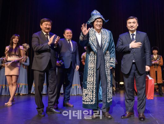 [이데일리 김태형 기자] 이기재(오른쪽 두번째) 양천구청장이 21일 양천문화회관에서 열린 ‘비술탄 댄스 앙상블 초청공연’에서 카자흐스탄 전통의상을 입고 주한 카즈흐스탄 대사와 무대에 올라 인사를 하고 있다.
