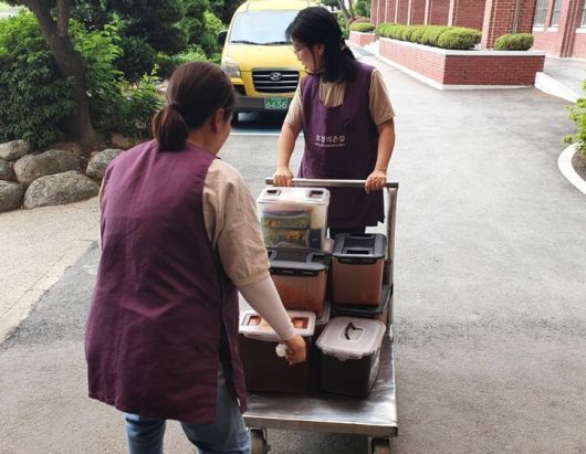 사회복지법인 ‘효경의손길’ 관계자들이 학교급식 잔식을 통에 담아 이동하고 있다. 효경의손길 제공 |
