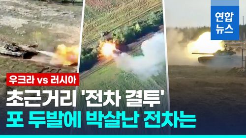 (서울=연합뉴스) 우크라이나와 러시아 전차가 초근거리에서 맞대결을 펼치는 영상이 공개됐습니다.