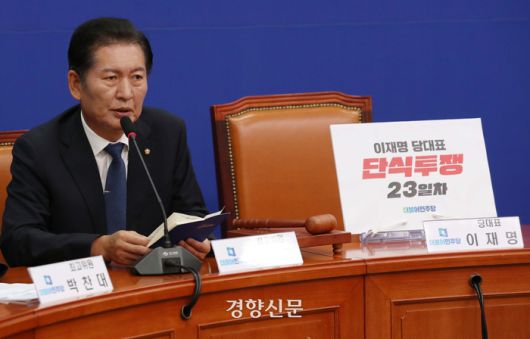 정청래 더불어민주당 최고위원이 22일 국회에서 열린 최고위원회의에서 발언하고 있다. 이날로 단식 23일 차인 이 대표의 자리가 비어 있다. 박민규 선임기자 |