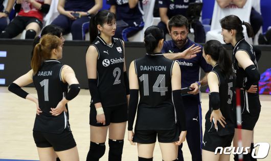 2일 경기도 수원시 서수원칠보체육관에서 열린 '2023 국제배구연맹(FIVB) 발리볼내셔널리그(VNL)' 3주차 대한민국과 폴란드의 경기에서 세사르 곤살레스 여자배구 감독이 선수들에게 지시를 내리고 있다. 대한민국은 이날 0대3으로 완패했다. 이로써 한국은 지난해에 이어 2년 연속으로 VNL 12전 전패, 승점 0을 기록하며 27연패 수모를 당하며 대회를 마쳤다. 2023.7.2/뉴스1 ⓒ News1 이동해 기자 |