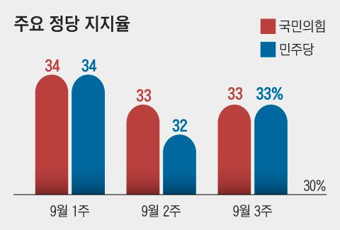 갤럽 조사에서는 최근 2주간 지지율이 국민의힘은 34→33→33%였고 민주당도 34→32→33%로 양쪽 다 제자리걸음 중이다. 정의당은 4%, 지지 정당이 없는 무당층(無黨層)은 올 들어 최고 수준인 10명 중 3명(29%)이었다.