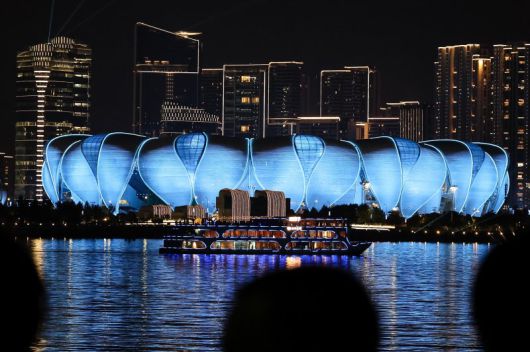 2022 항저우 아시안게임 개막을 4일 앞둔 19일 개회식이 열릴 올림픽 스포츠센터 스타디움에 라이트쇼가 펼쳐지고 있다. 사진=뉴스1 |