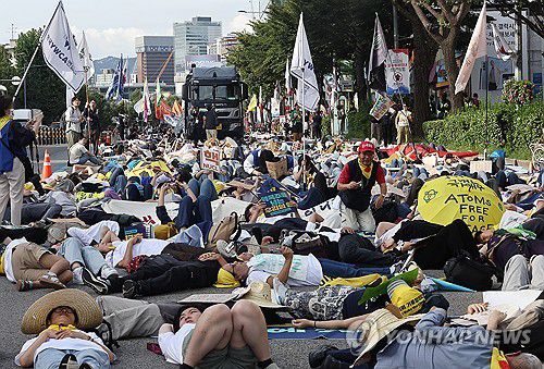 (서울=연합뉴스) 윤동진 기자 = 23일 서울시청역 인근에서 열린 ‘9.23기후정의행진’에서 참가자들이 남영역 방향으로 행진 중 바닥에 눕는 퍼포먼스를 하고 있다. 2023.9.23 mon@yna.co.kr ▶제보는 카카오톡 okjebo▶연합뉴스 앱 지금 바로 다운받기~▶네이버 연합뉴스 채널 구독하기 <저작권자(c)연합뉴스. 무단전재-재배포금지.>