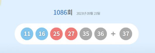 [이데일리 김연지 기자] 로또복권 운영사 동행복권은 23일 로또 제1086회 당첨번호 추첨에서 11·16·25·27·35·36번을 1등 당첨번호로 뽑았다. 2등 보너스 번호는 37번이다.