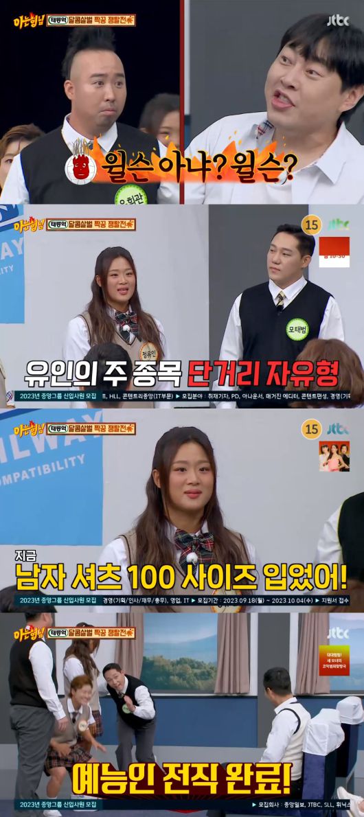 23일 방송된 JTBC '아는 형님'에는 수영선수 정유인이 출연해 어깨너비를 자랑했다.