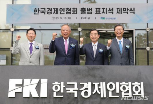 [서울=뉴시스] 김금보 기자 = 19일 오전 서울 영등포구 FKI타워 앞에서 열린 한국경제인협회(옛 전국경제인연합회) 출범 표지석 제막식 행사에 참석한 조현준(왼쪽부터) 효성 회장, 류진 한국경제인협회 회장, 김윤 삼양홀딩스 회장, 김창범 한국경제인협회 상근부회장이 표지석 제막을 마치고 기념촬영 하고 있다. 전국경제인연합회는 ‘한국경제인협회’로 55년 만에 이름을 바꾸고 새로 출범했다. 2023.09.19. kgb@newsis.com